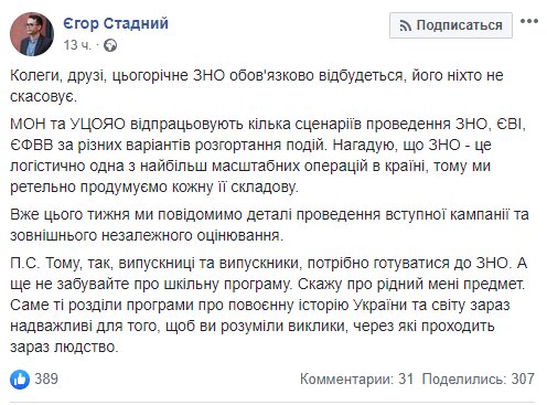 Однако с уверенностью заявили, что внешнее независимое оценивание (ВНО) в этом году обязательно состоится. Об этом пишет заместитель главы Министерства образования Егор Стадный у себя на страничке в соцсети Фейсбук.