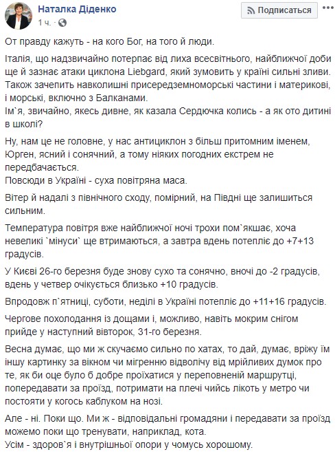В четверг, 26 марта, по всей территории Украины - сухая воздушная масса.