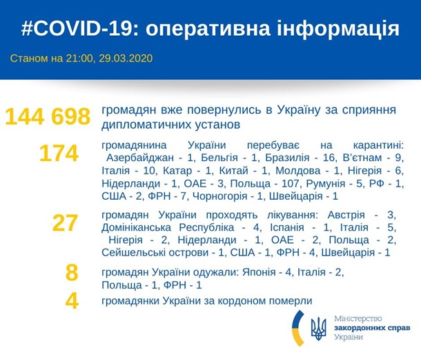 Выздоровели за пределами Украины восемь граждан: четверо в Японии, двое в Италии и по одному в Польше и ФРГ. Четыре гражданки Украины скончались за границей.