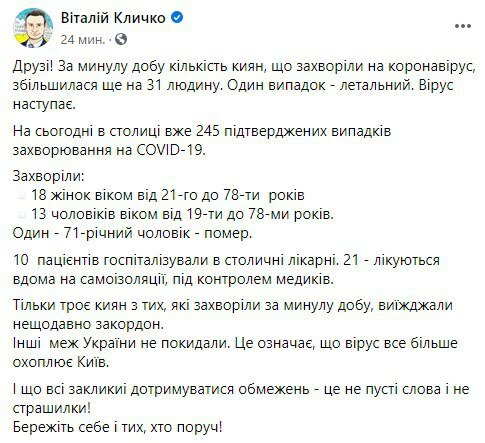 В свою очередь, мэр Киева Виталий Кличко рассказал, что за прошедшие сутки вирусом в столице заразился 31 человек. Также зафиксирован один летальный случай. Всего в Киеве зафиксированы 245 случаев заболевания.