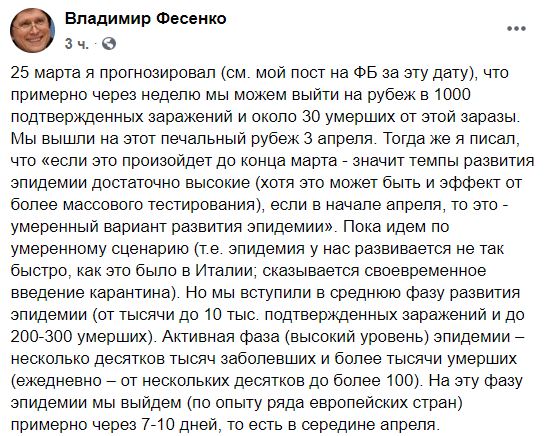 По его словам, Украина сейчас идет по умеренному сценарию развития эпидемии (благодаря карантину) и вошла в среднюю стадию (от тысячи до 10 тыс. подтвержденных заражений и до 200-300 умерших). В то же время он считает, что на активную стадию в несколько десятков тысяч заболевших и более тысячи умерших (ежедневно – от нескольких десятков до более 100) Украина выйдет примерно через 7-10 дней.