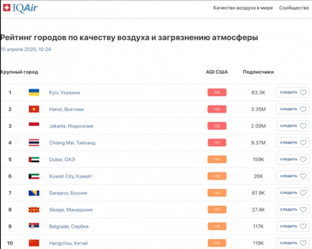 За сутки 10 апреля в Киеве оказался самый высокий уровень загрязнения воздуха - 159 единиц, из-за чего столица возглавила рейтинг городов с наибольшим загрязнением атмосферы в мире.