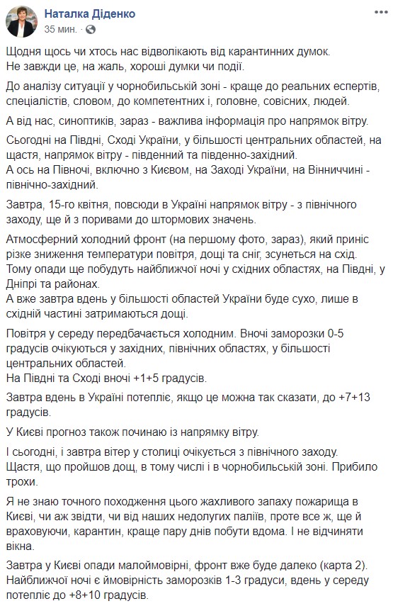 Сейчас атмосферный фронт пересекает Украину и контрасты в зоне фронта значительные: перед фронтом +15 +19 градусов, за фронтом +3 +6 градусов.