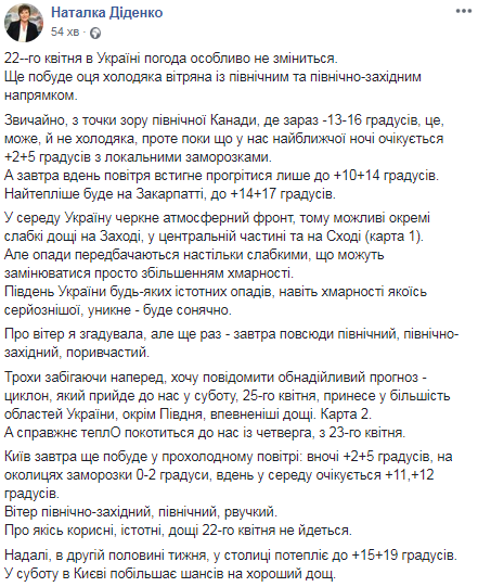 Об этом в Facebook сообщает синоптик Наталка Диденко.