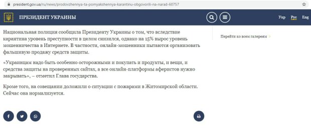 Также на сощании рассказали, что согласно данным Нацполиции, карантин поспособствовал снижению уровня преступности. В то же время на 15% вырос уровень мошенничества в Интернете. В частности, онлайн-мошенники пытаются организовать фальшивую продажу средств защиты.