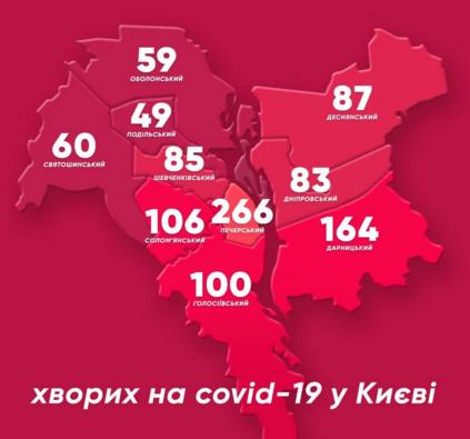 Общее количество зараженных коронавирусом в Киеве сегодня составляет 1059. За Печерским районом следует Дарница, Соломенка и Голосеево.