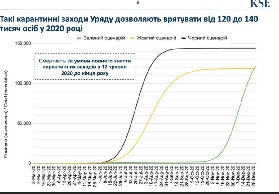 "Полная отмена карантина без внедрения обоснованных профилактических мероприятий - это 120-140 тысяч смертей до конца уже этого года. Такой вот прогноз получил от Kyiv School of Economics", - отметил санврач и показал соответствующие графики.