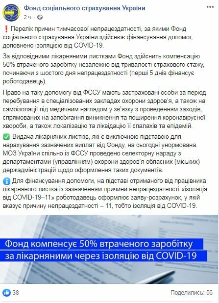 Восьмого мая стало известно, что Фонд соцстраха включил в перечень причин временной нетрудоспособности изоляцию в связи с китайским вирусом. Об этом сообщается на странице Фонда в Фейсбук.