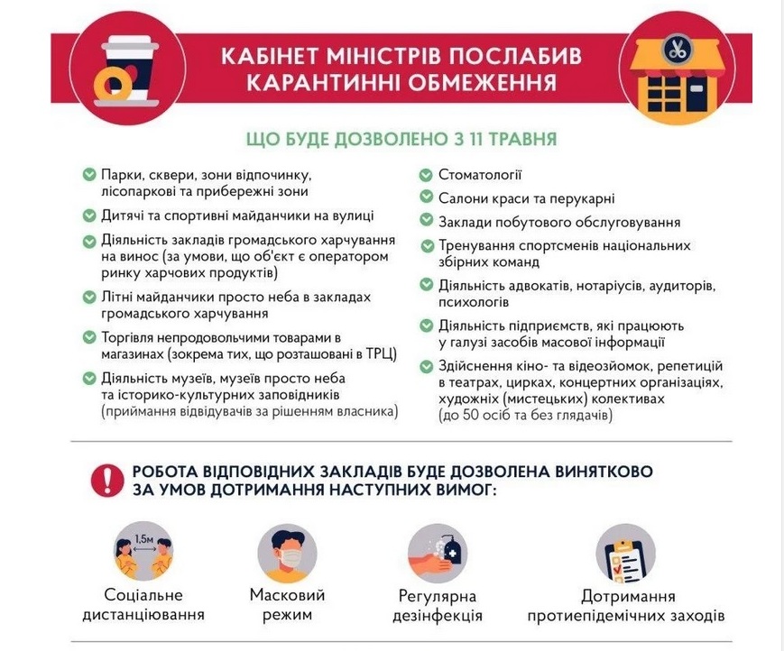 В рамках ослабления карантина, который ввели в Украине с 12 марта и продлили до 22 мая с 11 мая в Украине возобновят работу ряд объектов, в частности, магазины, которые расположены в отдельных помещениях.
