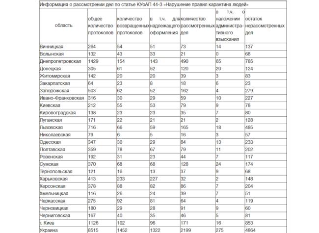 За время карантина в Украине составлено 8 515 протоколов по ст. 44-3 Кодекса Украины об административных правонарушениях ("Нарушение правил карантина"), из них 2 199 уже рассмотрены. О