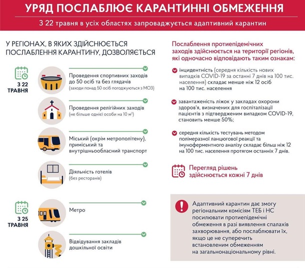"Мы продлеваем карантин до 22 июня и переходим к адаптивной модели. Это позволит региональным комиссиям ТЭБ и ЧС усиливать противоэпидемические ограничения на местах в случае обнаружения вспышек заболевания или ослаблять их, если это не противоречит установленным ограничениям на общенациональном уровне, а эпидемическая ситуация соответствует трем определенным критериям", - написал Шмыгаль.