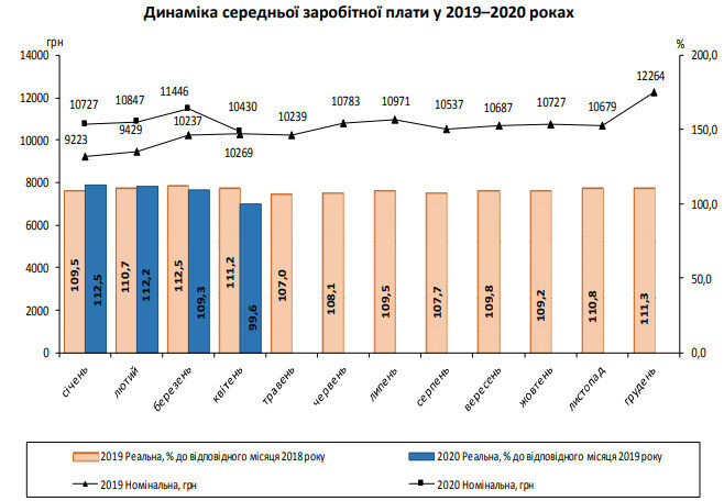 "Средняя номинальная заработная плата штатного сотрудника предприятий, учреждений и организаций в апреле 2020 года составила 10 430 грн, что в 2,2 раза выше уровня минимальной заработной платы (4723 грн). По сравнению с мартом, размер средней номинальной заработной платы уменьшился на 8,9%, а за последние 12 месяцев (относительно апреля 2019 года) – увеличился на 1,6%", – говорится в сообщении.