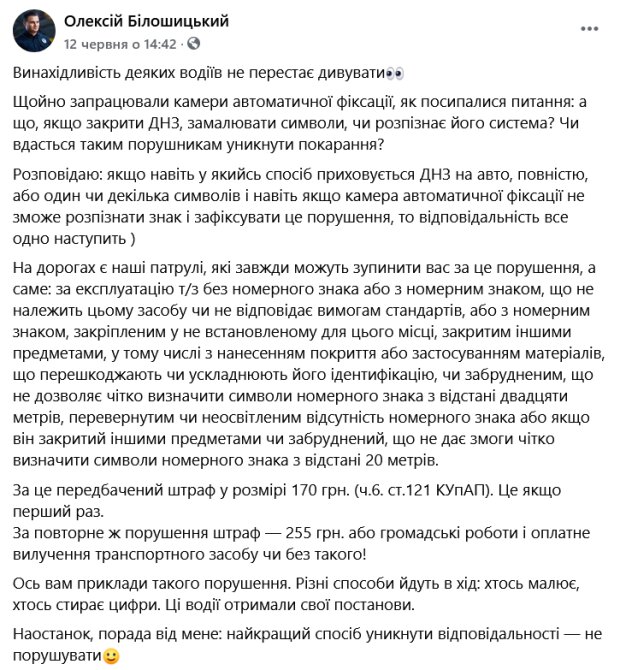 Впрочем, в полиции предупредили, что такой способ не только не спасет лихачей от наказания, но и повлечет за собой новые проблемы. Об этом рассказал замначальника департамента патрульной полиции Алексей Билошицкий на своей странице в Фейсбук.
