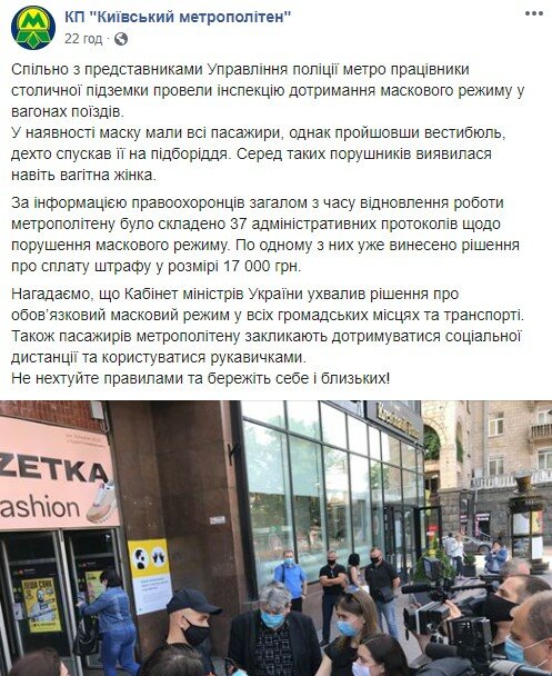 "По информации правоохранителей, с момента возобновления работы метрополитена было составлено 37 административных протоколов о нарушении масочного режима. По одному из них уже вынесено решение об уплате штрафа в размере 17 000 грн", – говорится в сообщении.