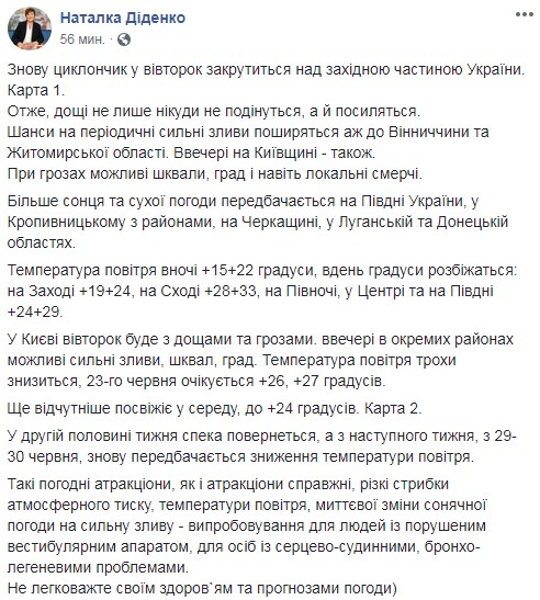 Об этом сообщает синоптик Наталья Диденко на своей Facebook-странице.