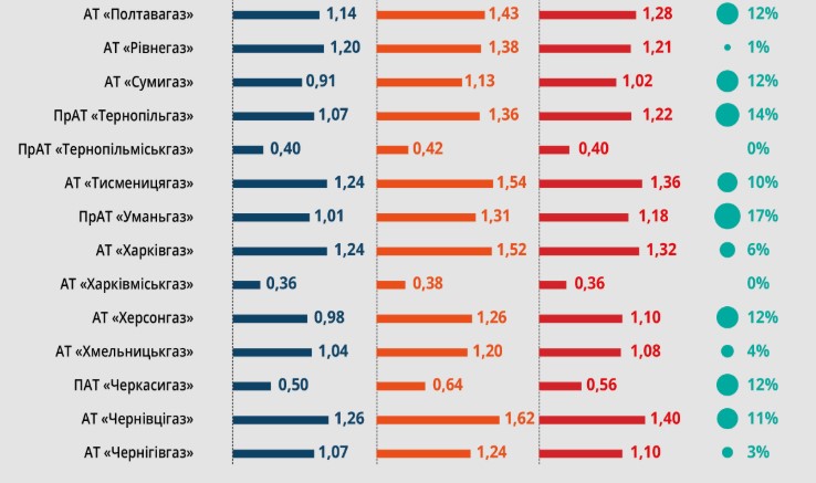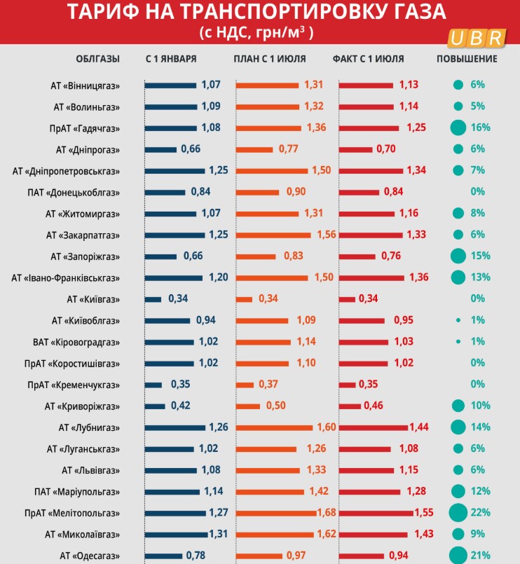Совсем не изменится тариф в платежках у клиентов Донецкоблгаза, Киевгаза, Коростышевгаза, Кременчуггаза, Тернопольгоргаза и Харьковгоргаза, а стоимость услуг Киевоблгаза, Кировоградгаза, Ривнегаза символически повысится на 1%. Однако существенно подорожают в июле платежки для украинцев, которым доставляет "голубое топливо" Мелитопольгаз (22%), Одессагаз (21%), Уманьгаз (17%), Гадячгаз (16%), Запорожгаз (15%).