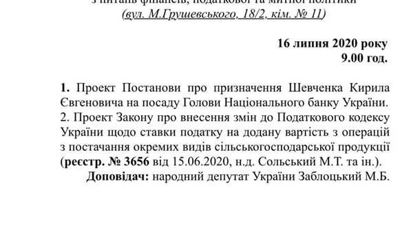 Он также опубликовал фотографию повестки дня внеочередного заседания комитета по вопросам финансов 16 июля, где первым пунктом стоит проект постановления о назначении Кирилла Шевченко главой Нацбанка.