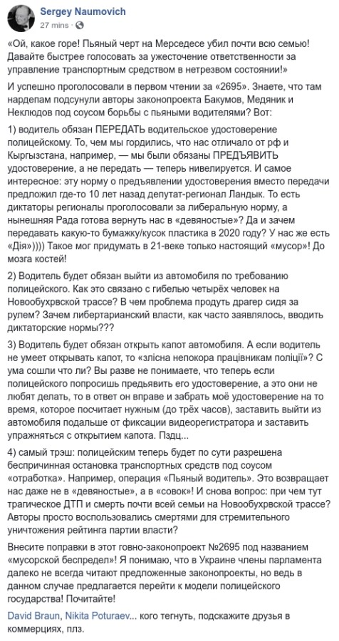 В свою очередь блогер Сергей Наумович в Facebook раскритиковал этот законопроект и назвал несколько моментов, которые вызывают тревогу.