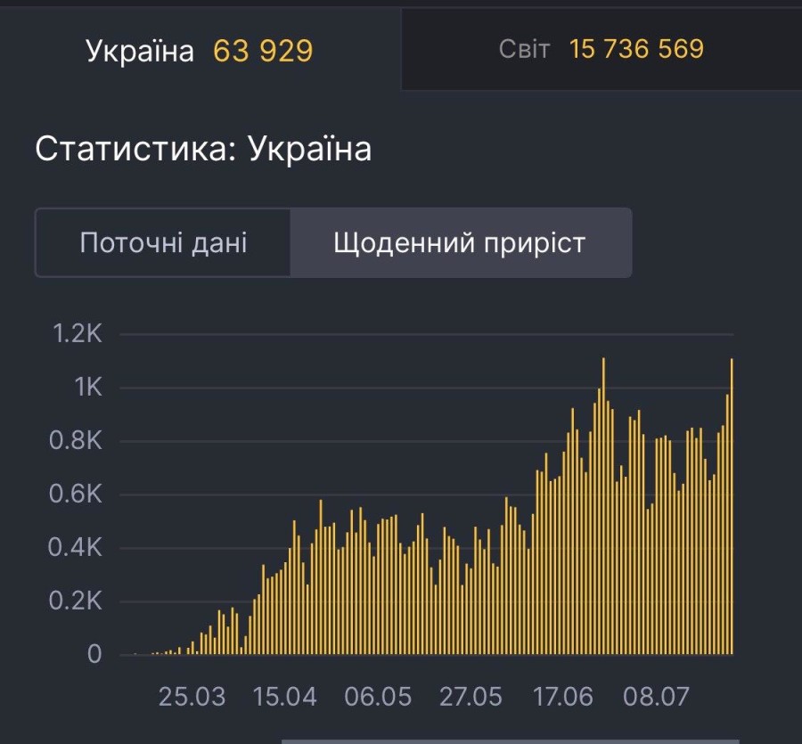 За минувшие сутки, 24 июля, в Украине обнаружили 1106 новых случаев заражения COVID-19. До повторения антирекорда не хватило 3-х случаев.