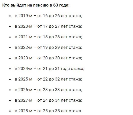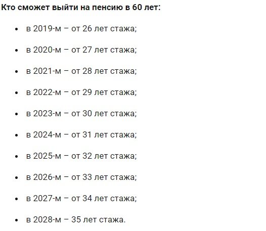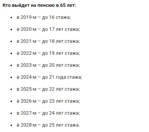 Сообщается, что уже в 2021 году пенсионный возраст для женщин будет повышен с 59,5 до 60 лет, а минимальное количество стажа вырастет до 29 лет. Также в 2022 году для выходя на пенсию необходимо будет иметь минимум 29 лет стажа.
