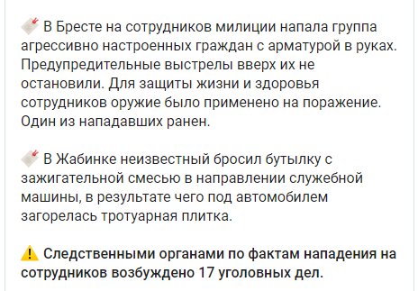 "На сотрудников милиции напала группа агрессивно настроенных граждан с арматурой в руках. Предупредительные выстрелы вверх их не остановили. Для защиты жизни и здоровья сотрудников оружие было применено на поражение. Один из нападавших ранен», — говорится в сообщении.