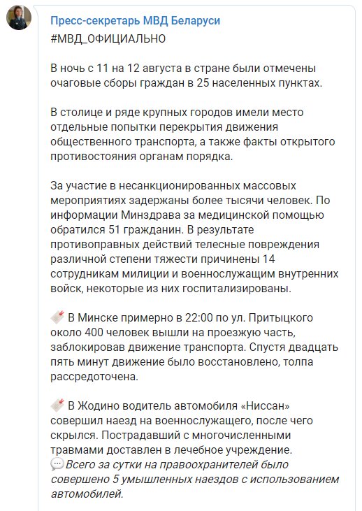 Напомним, отметим, что по предварительным данным ЦИК Беларуси, победу на выборах одержал Лукашенко с 80,23% голосов. По официальным данным Тихановская набрала 9,9% голосов.