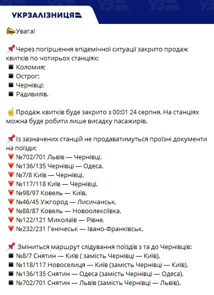 Также из-за эпидемических ограничений изменится маршрут следования поездов из и в Черновцы: