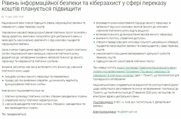 В документе говорится, что НБУ хочет установить четкие требования к участникам платежного рынка, которые затрагивают развитие системы защиты информации и кибербезопасности, и порядок действий при обнаружении кибератак, снижающих надежность функционирования платежных систем.