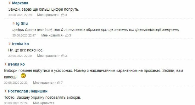"Вот уже и за положение начинают говорить", "То есть, Западную Украину лишают выборов", "Захват власти превыше всего", "Вброс с целью выяснить реакцию и оценить риски", "Если выборы будут проводиться в красных зонах, то чрезвычайное положение за неделю-две самостоятельно появится - без объявления", "Выборы должны пройти во всех зонах, номер с чрезвычайным положением не проканает", - написали они в комментариях.
