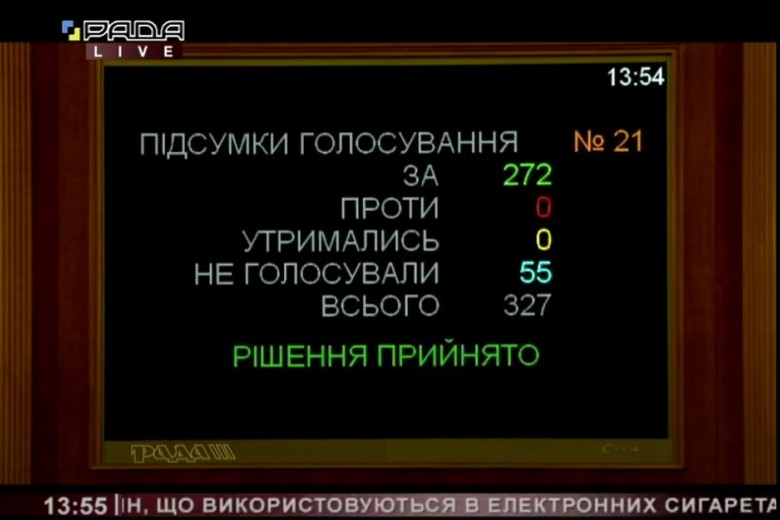 Принятие закона "О внесении изменений в некоторые законодательные акты Украины относительно усиления ответственности за правонарушения в сфере продажи детям электронных сигарет и жидкостей, используемых в электронных сигаретах" поддержали 272 народных депутата. Никто не был против. Но не голосовали 55 депутатов.