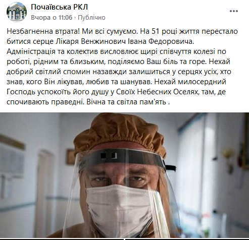 "Непостижимая потеря! Мы все скорбим. На 51 году жизни перестало биться сердце врача Венжинович Ивана Федоровича", - написали в посте.