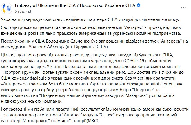 "Интересно, что в этом году подготовка ракеты к запуску, которая всегда происходит в США, сопровождалась дополнительными вызовами из-за пандемии COVID-19 и ограничения международных поездок. В апреле посольство активно помогало американской компании "Нортроп Грумман" организовать отдельный специальный рейс, чтобы доставить из Украина в США команду специалистов из украинских космических предприятий, без участия которых запустить "Антарес" по графику было бы невозможно", – говорится в сообщении.