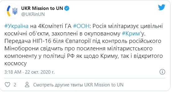 На заседании комитета Генассамблеи ООН миссия Украины заявила о российской милитаризации гражданских космических объектов в аннексированном Крыму.