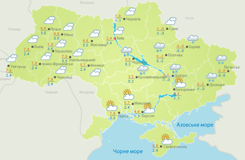 В центральных областях, в частности в Кировоградской и Черкасской, пройдут дожди со снегом. Днем столбики термометров покажут -2...+7.