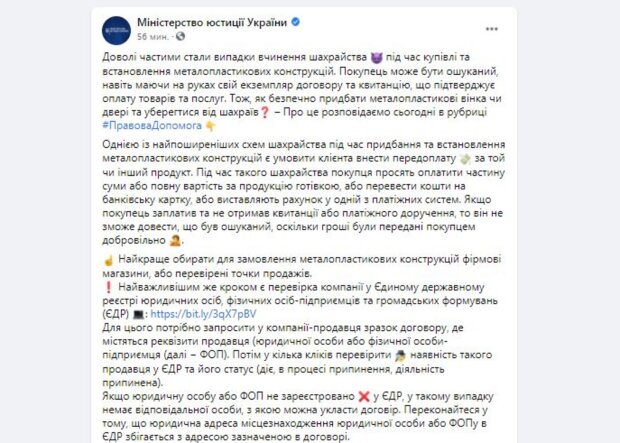 "Во время такого мошенничества покупателя просят оплатить часть суммы или полную стоимость за продукцию наличными, или перевести деньги на банковскую карту, или выставляют счет в одной из платежных систем. Если покупатель заплатил и не получил квитанции или платежного поручения, то он не сможет доказать, что был обманут, поскольку деньги были переданы покупателем добровольно", - предупреждают украинцев в Минюсте.