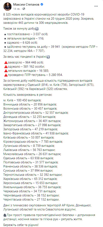 "8 325 новых случаев коронавирусной болезни Covid-19 зафиксировано в Украине по состоянию на 20 декабря 2020 года. В частности, заболели 443 ребенка и 306 медработников", - сказал он.