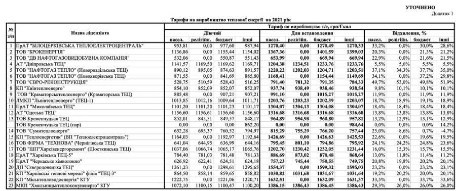 В четверг, 24 декабря, на заседании Национальной комиссии, осуществляющей государственное регулирование в сферах энергетики и коммунальных услуг (НКРЭКУ), были пересмотрены тарифы на производство тепловой энергии для всех 23 украинских компаний.