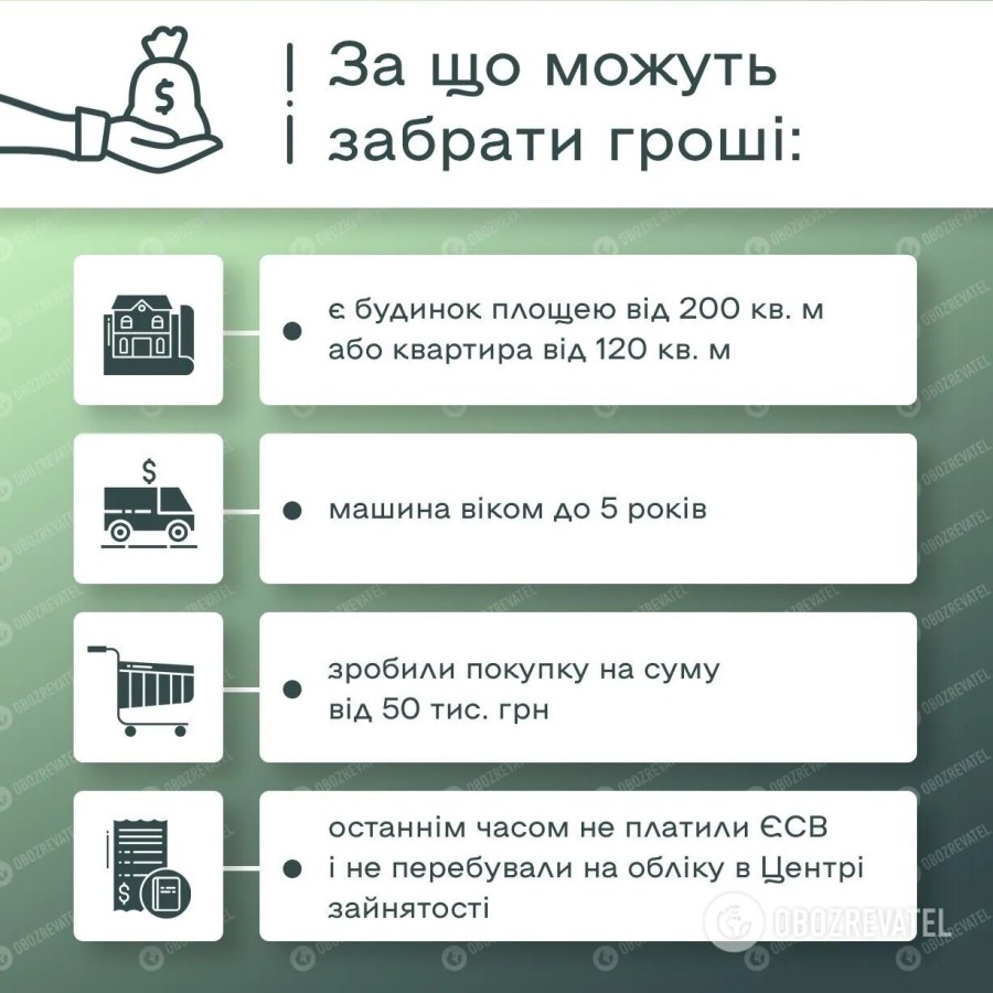 На предоставление выплат не смогут претендовать те, у кого обнаружат большой дом или квартиру. Также это касается украинцев, которые за последние несколько лет совершили крупную покупку.