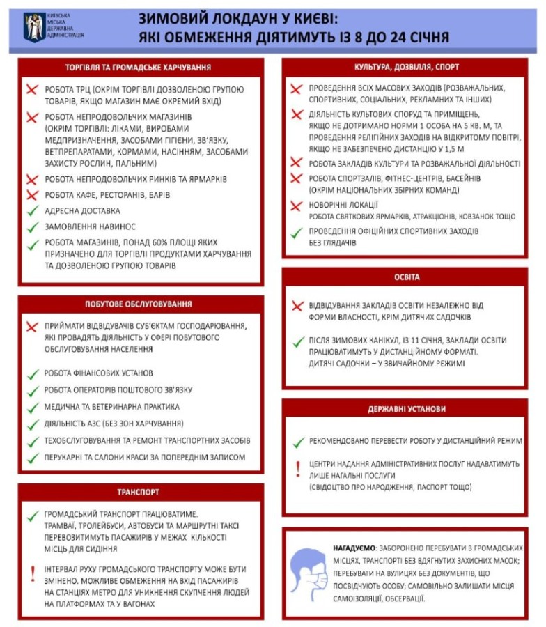 Киевская городская госадминистрация разъяснила, какие ограничения будут действовать в столице с 8 по 24 января во время введенного Кабмином локдауна из-за пандемии коронавируса COVID-19.