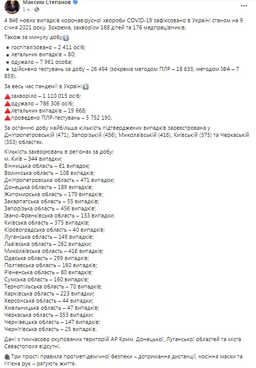 По состоянию на 9 января в Украине выявили 4846 новых случаев заражения коронавирусом COVID-19.
