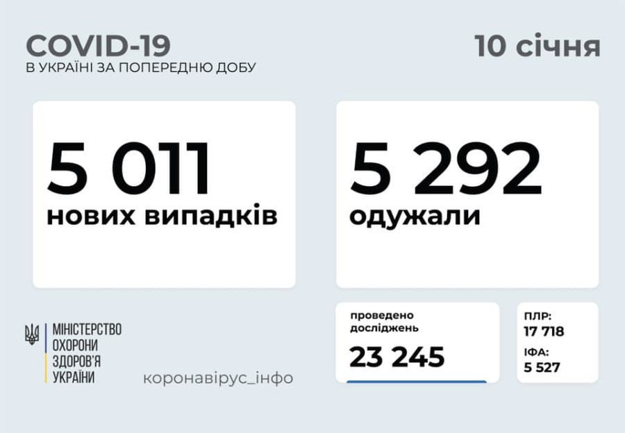 В воскресенье утром, 10 января, количество зараженных коронавирусом в Украине возросло на 5 011 человек. Скончались 99 пациентов.