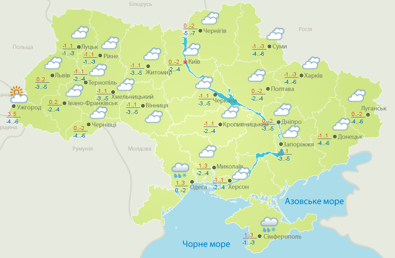 В первый день новой рабочей недели в Одесской области и в Крыму ожидаются снегопады с дождем. Во всех остальных регионах будет холодно и пасмурно. Температура днем будет колебаться от -2 до +2, однако по ночам синоптики прогнозируют морозы.