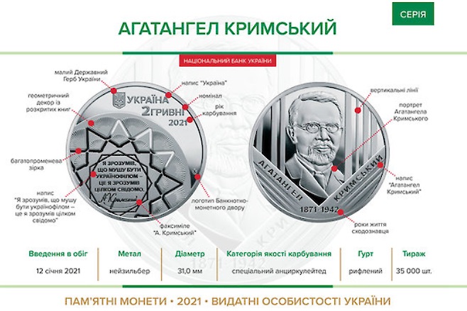 Нацбанк Украины 12 января вводит в оборот новую памятную монету. Она посвящена украинскому историку, слависту, языковеду, востоковеду, писателю, переводчику, одному из основателей Украинской Академии наук – Агафангелу Крымскому, сообщает пресс-служба НБУ.