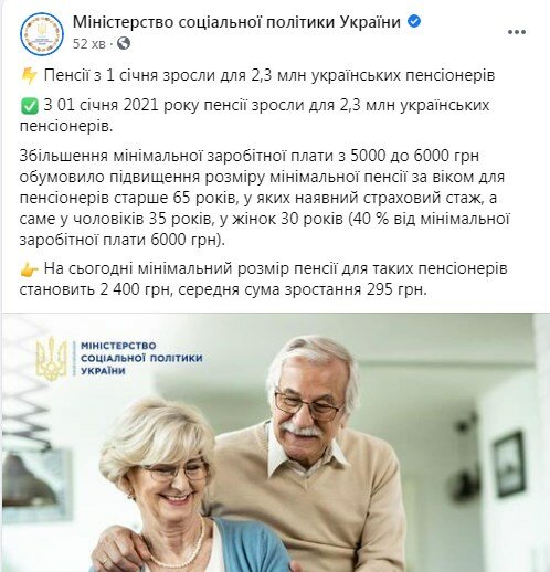 Отмечается, что увеличение минимальной заработной платы с 5000 до 6000 грн обусловило повышение размера минимальной пенсии по возрасту для пенсионеров старше 65 лет, у которых имеется страховой стаж, а именно у мужчин 35 лет, у женщин 30 лет (40% от минимальной заработной платы 6000 грн).