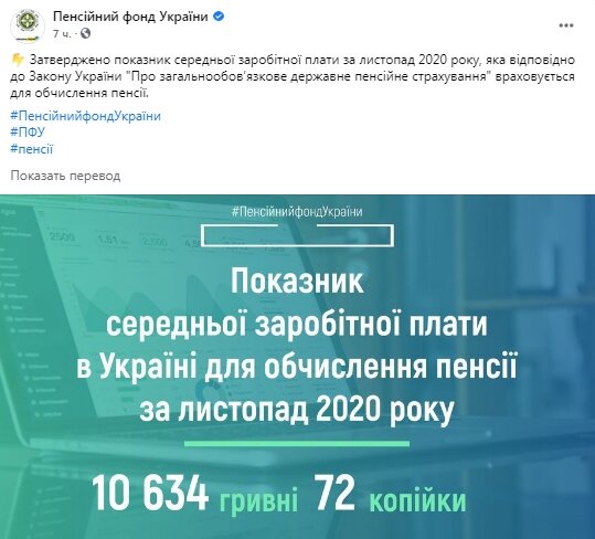 "Утвержден показатель средней заработной платы за ноябрь 2020 года, которая в соответствии с Законом Украины" Об общеобязательном государственном пенсионном страховании" учитывается для исчисления пенсии", — указано в сообщении.