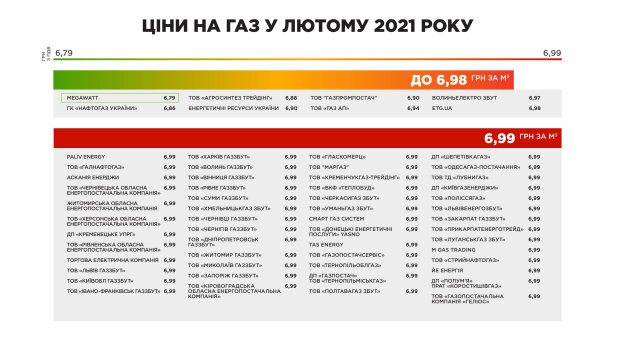 Например, поставщик Megawatt предложил своим клиента цену 6,79, газоснабжающая компания "Нафтогаз Украины" - 6,86, "Агросинтез Трейдинг" - 6,88, Энергетические ресурсы Украины - 6,90, "Газ АП" - 6,94, Волыньелектро Сбыт - 6,97, а ETG.UA - 6,98 грн за кубометр.