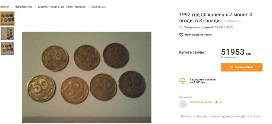 Так, на аукционах за 7 редких монет 1992 года выпуска просят около 52 тыс. грн. Стоит отметить, что коллекция из нескольких монет будет стоить больше, чем каждая из них по отдельности. Это связано с тем, что нумизматы могут тратить дни и недели выискивая "нужные" экземпляры, а в случаи с коллекцией покупают сразу набор.