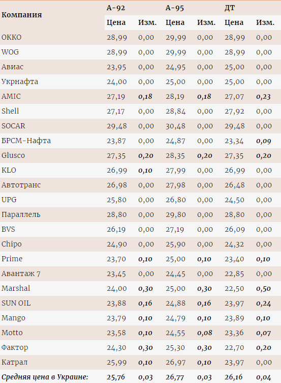 В частности, компания "БРСМ-Нафта" подняла цены на дизельное топливо на 10-20 коп./л, до 22,99-23,19 грн/л. При этом в среднем по сети ДТ подорожало на 9 коп./л, до 23,34 грн/л. Цена бензинов на "БРСМ" осталась на прежнем уровне.