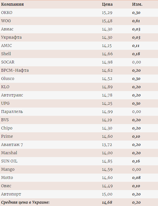 В сетях ОККО и WOG продукт подорожал на 30 и 61 коп./л, до 15,29 и 15,48 грн/л соответственно. На 20 коп./л автогаз подорожал на станциях "БРСМ-Нафта".