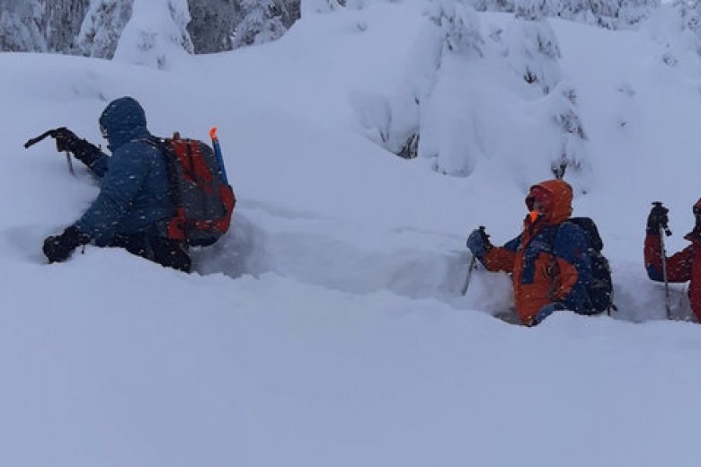 Вчера спасатели нашли возможный след пропавшего туриста, но двигаться по следу трудно, потому что все трое суток в этом районе шел снег и следы частично заметены.